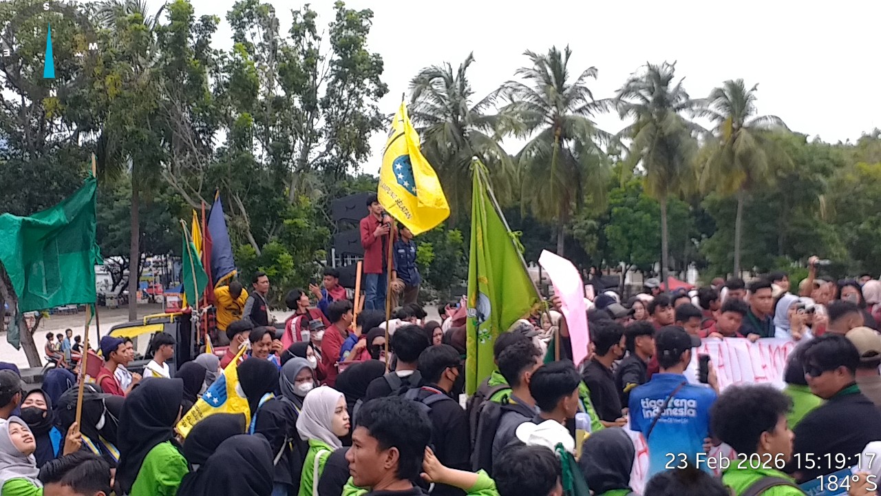 KABUPATEN LAMPUNG SELATAN – Dalam Ratusan orang Aksi yang terdiri pada Mahasiswa&Mahasiswi yang tergabung dalam Aliansi Cipayung Plus dan BEM se-Lampung Selatan menggelar aksi unjuk rasa di halaman Kantor Bupati Lampung Selatan, pada Senin 23 Februari 2026 sekitar pukul 13.37 WIB.
