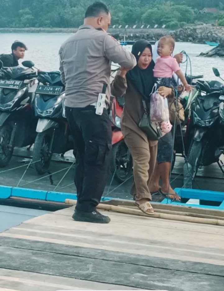 KABUPATEN LAMPUNG SELATAN – Aksi simpatik ditunjukan Anggota Satlantas Polres Lampung Selatan, Aipda Deni Meydistira, saat membantu warga seorang ibu menggendong anak kesulitan turun dari kapal perahu menuju di Dermaga Canti, Kecamatan Rajabasa Lampung Selatan.