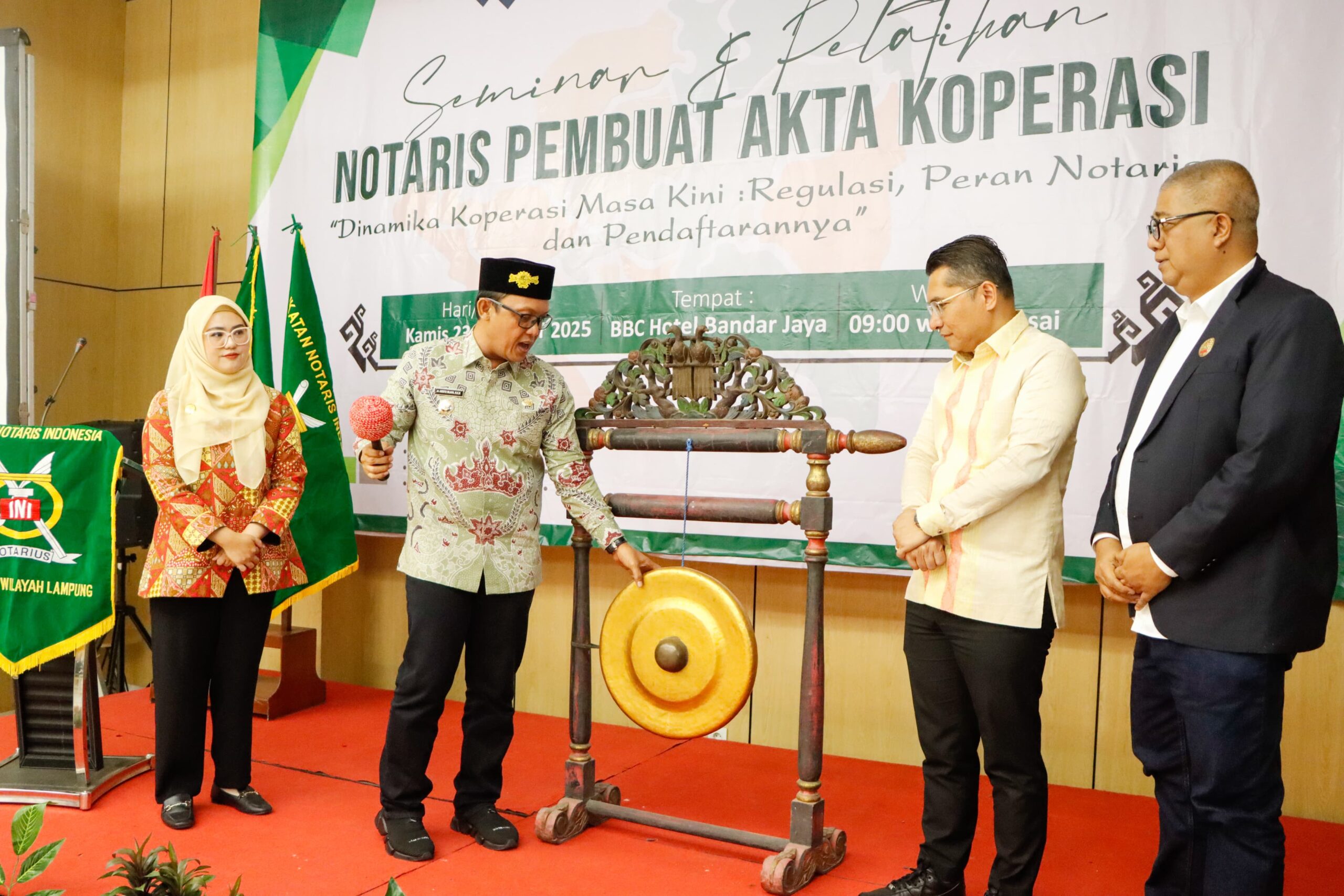 Bupati Lampung Tengah, dr. H. Ardito Wijaya, M.K.M., membuka secara resmi kegiatan Seminar dan Pelatihan Notaris Pembuat Akta Koperasi yang diselenggarakan oleh Pengurus Daerah Ikatan Notaris Indonesia (INI) Lampung Tengah, bekerja sama dengan Kementerian Koperasi Republik Indonesia. Kegiatan ini berlangsung di Hotel BBC, Bandar Jaya, Kamis (23/10/2025).