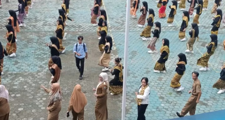 Kehadirannya makin meriah saat ia ikut menari Bedana bersama 200 siswi SMA Negeri 2 Kalianda.