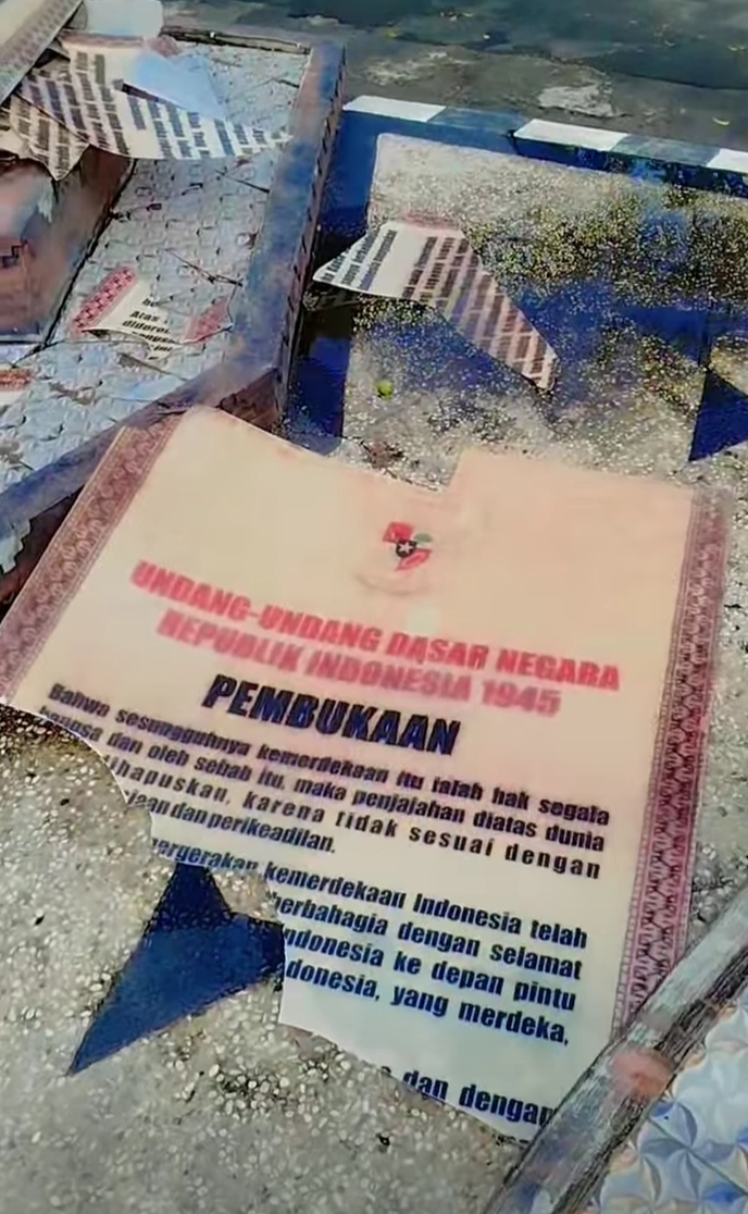 “Kurang tau pak kami, siapa yang melakukan pengrusakan pada teks Pancasila itu, semalem kayaknya pak malam sabtu, karna tadi pagi kami liat ada petugas Pol PP yang membersihkan puing puing bahan acrylic itu,” ungkap salah satu pedagang kopi di areal tersebut.