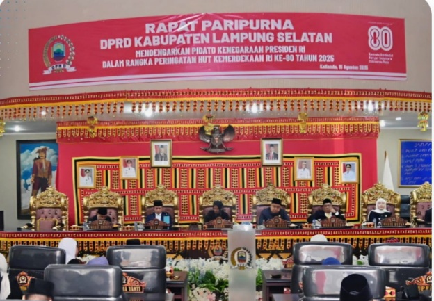 KABUPATEN LAMPUNG SELATAN – Dewan Perwakilan Rakyat Daerah (DPRD) Kabupaten Lampung Selatan (Lamsel) menggelar Rapat Paripurna Istimewa dalam rangka peringatan Hari Ulang Tahun (HUT) ke-80 Proklamasi Kemerdekaan Republik Indonesia, pada Jum’at 15 Agustus 2025.