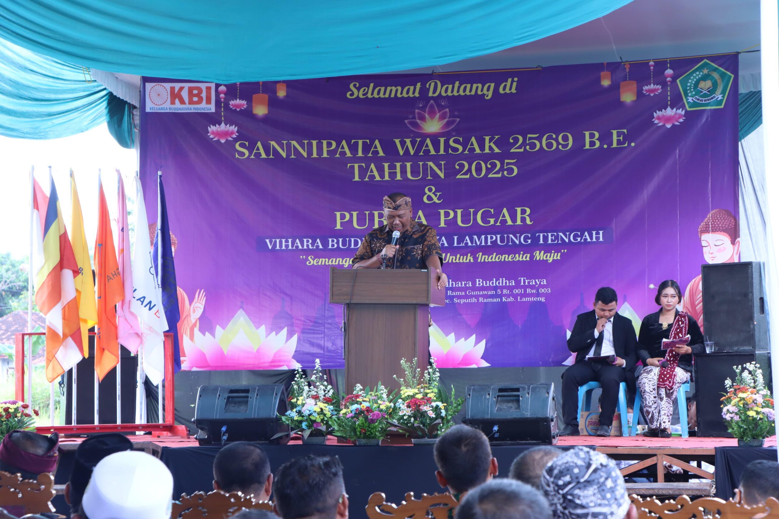 Lampung Tengah-(BP)-Wakil Bupati Lampung Tengah I Komang Koheri menghadiri Sannipati Waisak 2569 B.E Tahun 2025 sekaligus meresmikan Vihara Buddha Traya, Minggu (15/06/2025).