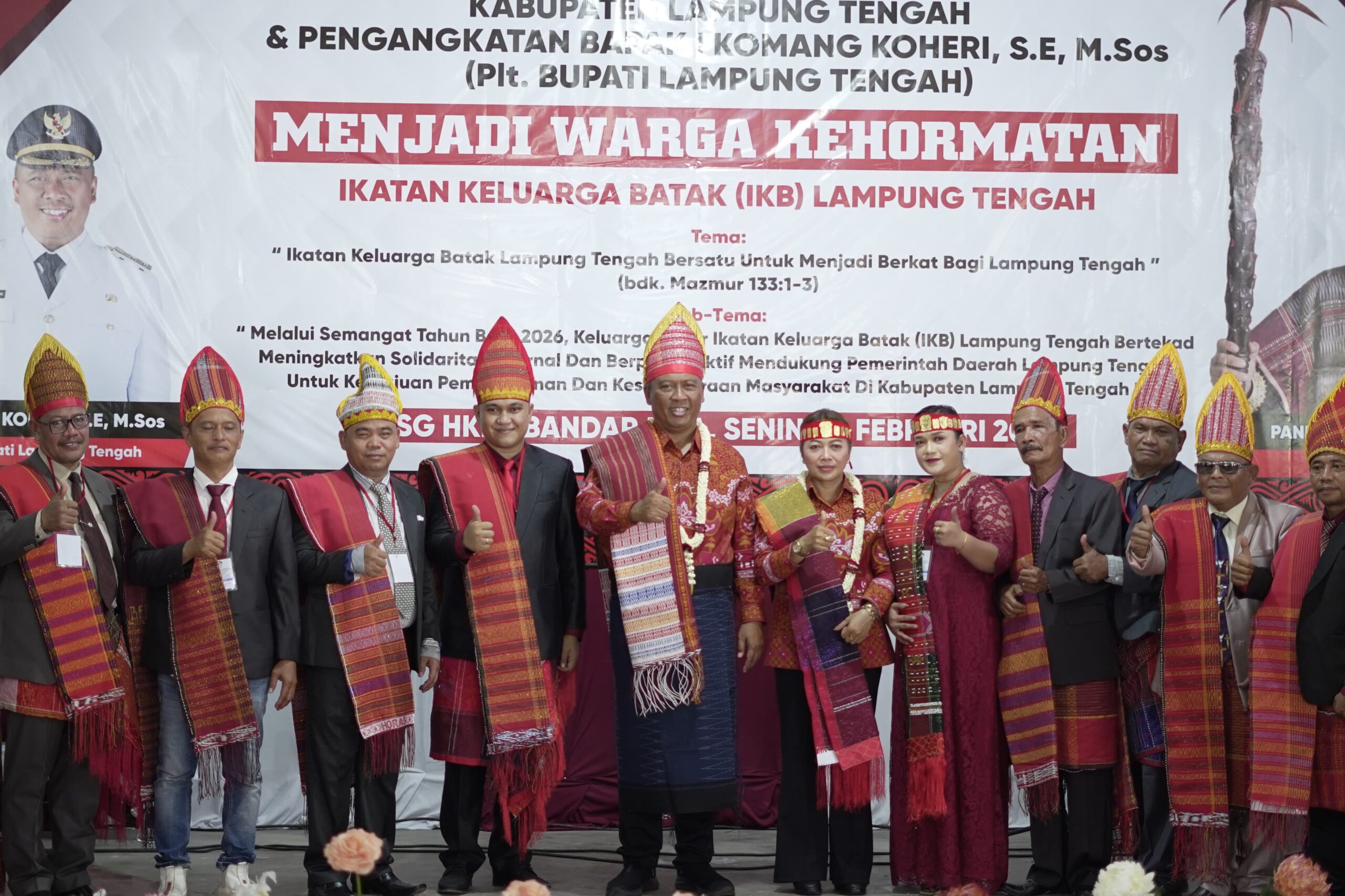 Pelaksana Tugas (Plt.) Bupati Lampung Tengah, I Komang Koheri, S.E., M.Sos., bersama Plt. Ketua TP PKK Lampung Tengah, Ni Ketut Dewi Nadi Komang Koheri, S.T., M.Sos., resmi diangkat sebagai Warga Kehormatan Ikatan Keluarga Batak (IKB) Lampung Tengah.