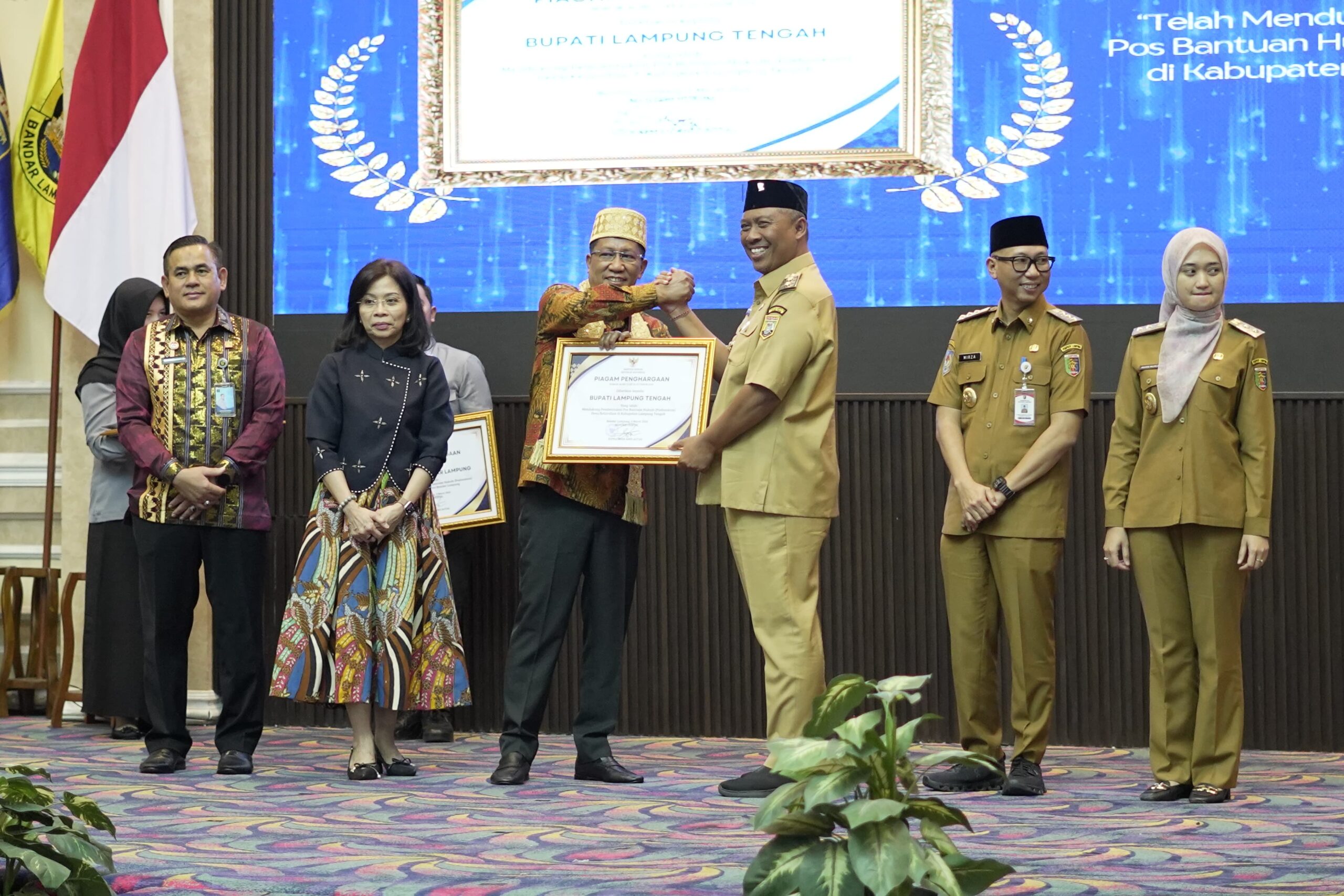 Pelaksana Tugas (Plt.) Bupati Lampung Tengah, I Komang Koheri, S.E., M.Sos., menerima penghargaan dari Kementerian Hukum Republik Indonesia yang diserahkan langsung oleh Menteri Hukum RI, Dr. Supratman Andi Agtas, S.H., M.H., dalam rangkaian acara Peresmian Pos Bantuan Hukum Desa/Kelurahan Provinsi Lampung. Kegiatan tersebut berlangsung di Balai Keratun, Bandar Lampung, pada Senin (9/3/2026).