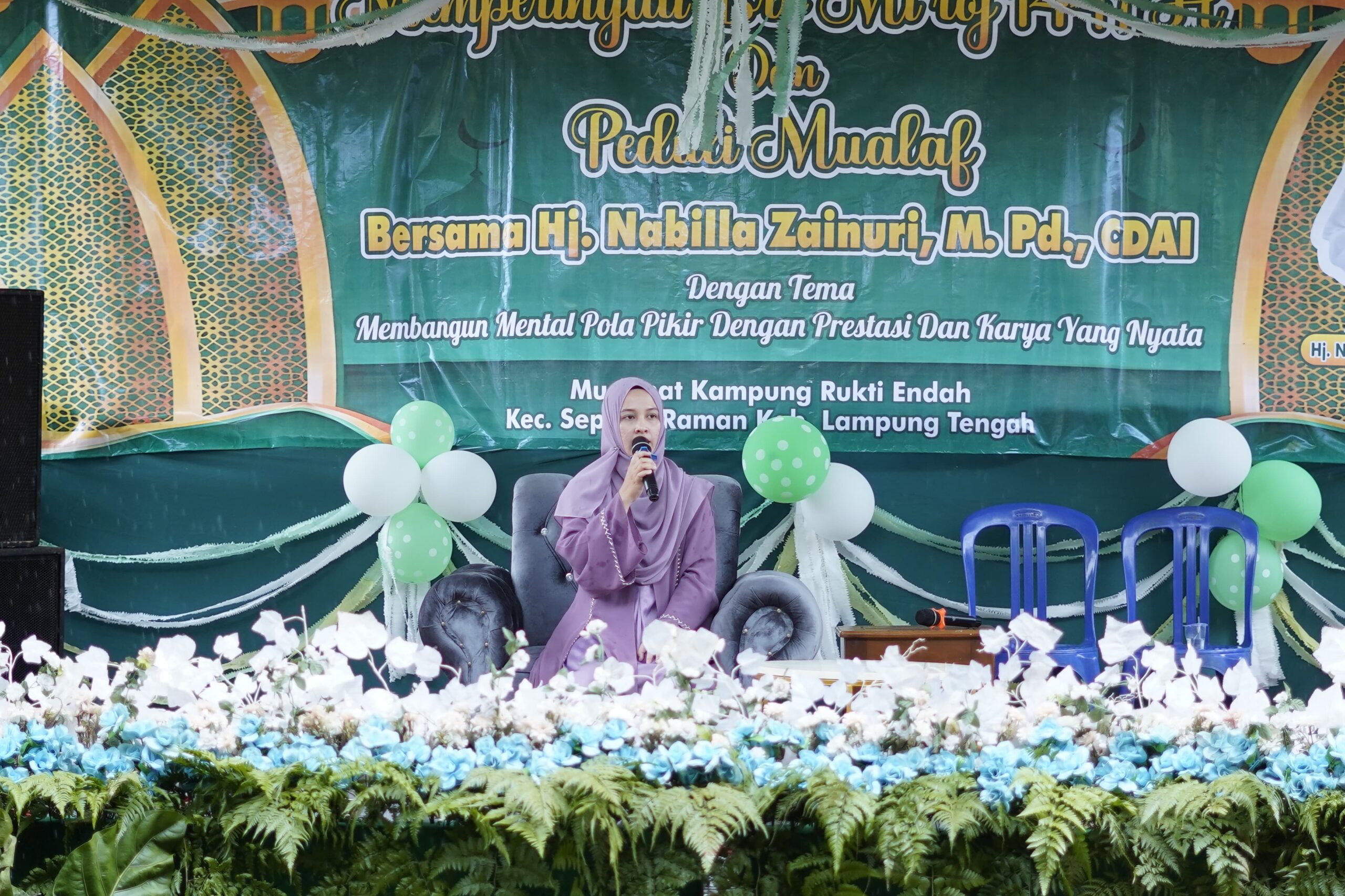 Kampung Rukti Endah, Kecamatan Seputih Raman, menggelar peringatan Isra Mi’raj Nabi Muhammad SAW 1447 Hijriah yang dirangkaikan dengan kegiatan Peduli Mualaf, Minggu (11/1/2026).