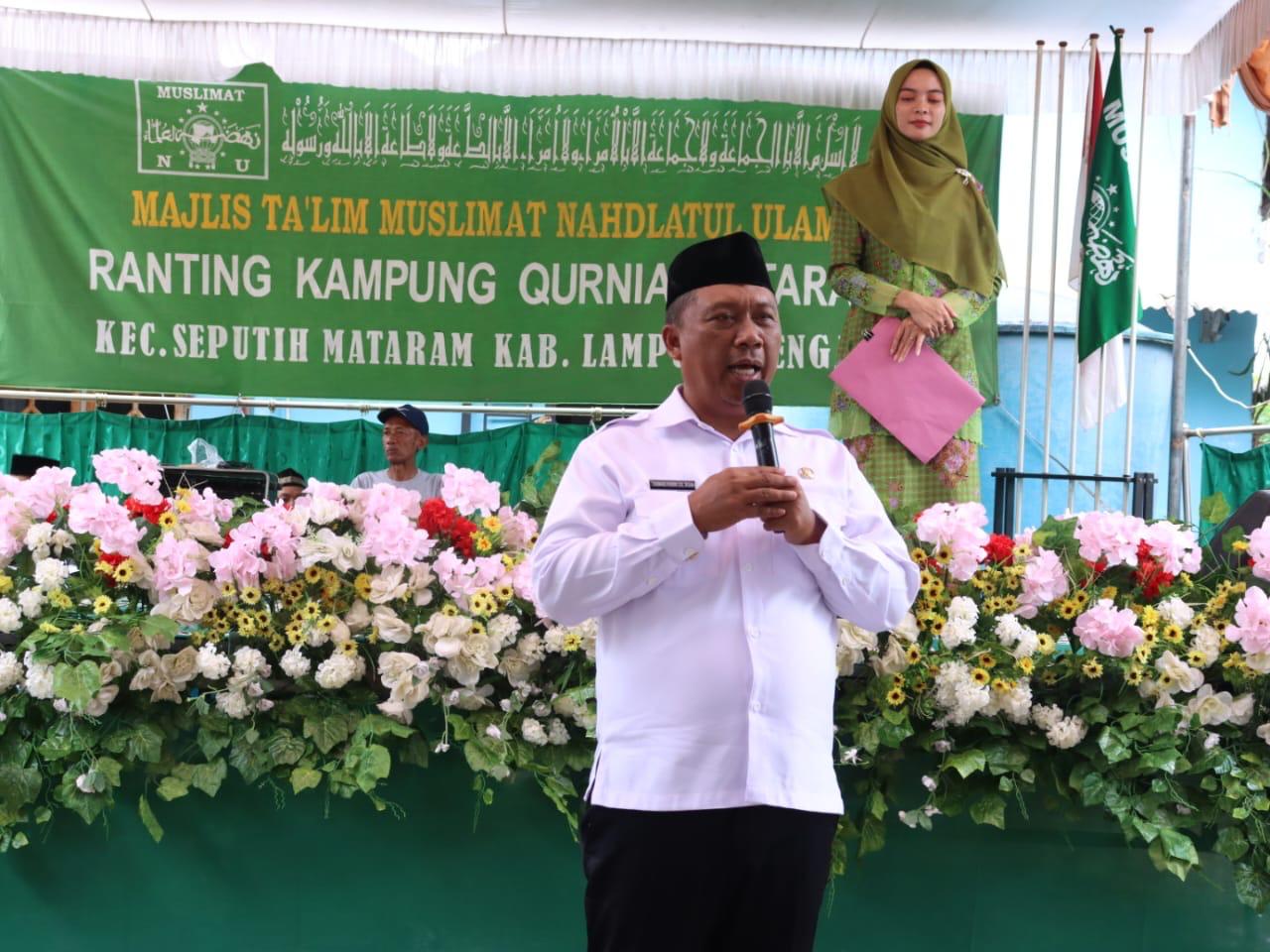 Kegiatan keagamaan tersebut berlangsung khidmat dan dihadiri oleh Camat Seputih Mataram, Fran Dalomes Arida, S.E., unsur Forkopimcam Seputih Mataram, Kepala Kampung Qurnia Mataram, pengurus Majlis Ta’lim Muslimat NU, serta para tamu undangan dan jamaah.