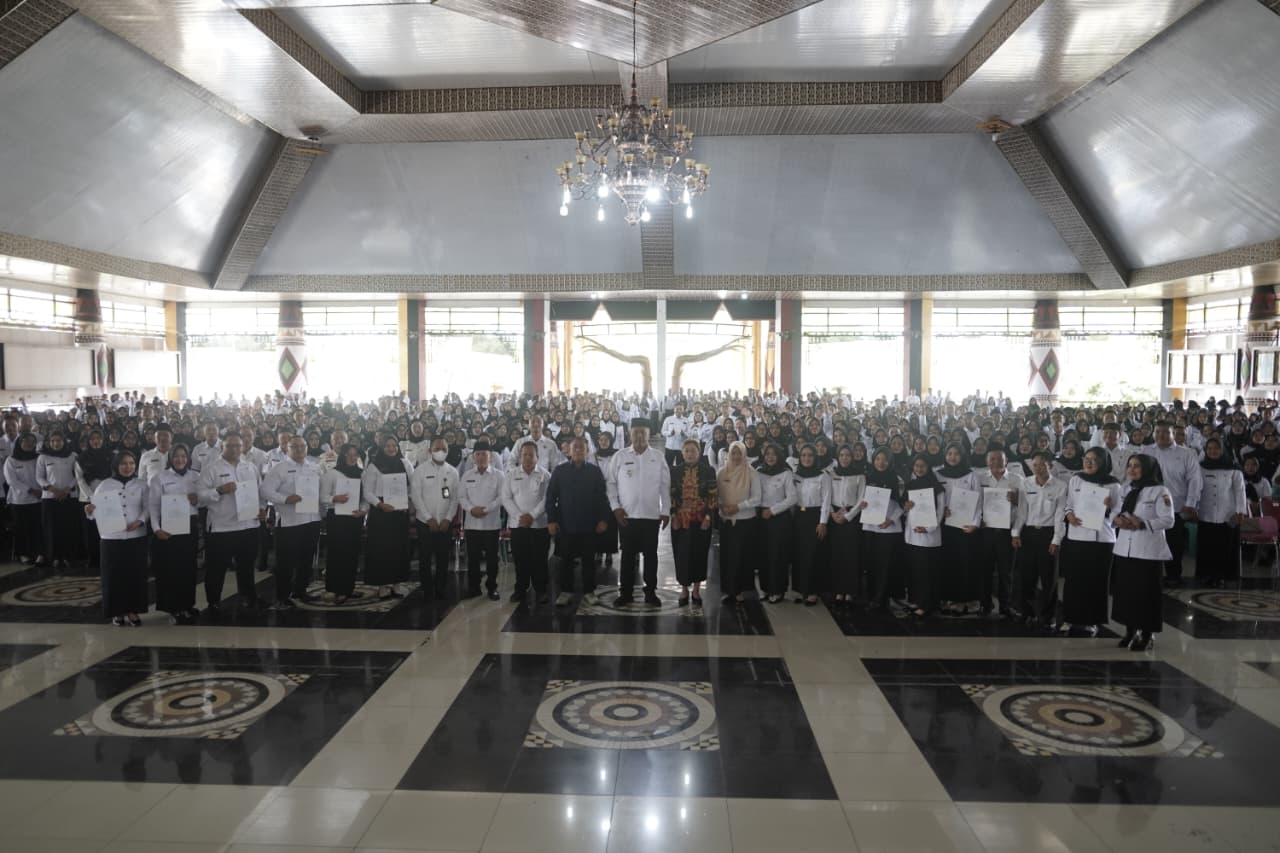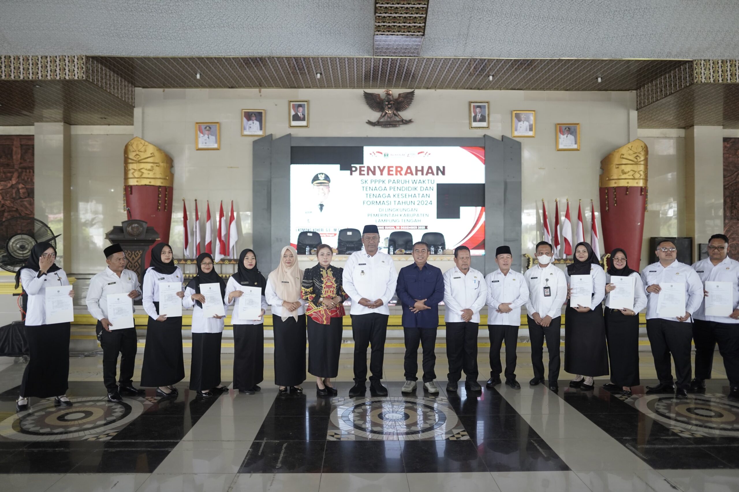 Pemerintah Kabupaten Lampung Tengah secara resmi menyerahkan Surat Keputusan (SK) Pegawai Pemerintah dengan Perjanjian Kerja (PPPK) Paruh Waktu Formasi Tenaga Kesehatan dan Tenaga Guru kepada sebanyak 3.052 orang. Penyerahan petikan SK tersebut dilakukan langsung oleh Pelaksana Tugas (Plt) Bupati Lampung Tengah, I Komang Koheri, bertempat di Gedung Sesat Agung Nuwo Balak, Rabu (31/12/2025).
